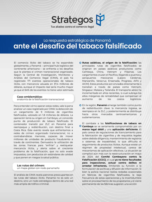 Compartimos nuestro más reciente análisis: “La respuesta estratégica de Panamá ante el desafío del tabaco falsificado”. Un caso de estudio que aborda el mapa global del nodo panameño, el modus operandi identificado y la respuesta basada en inteligencia y cooperación internacional para combatir este fenómeno.